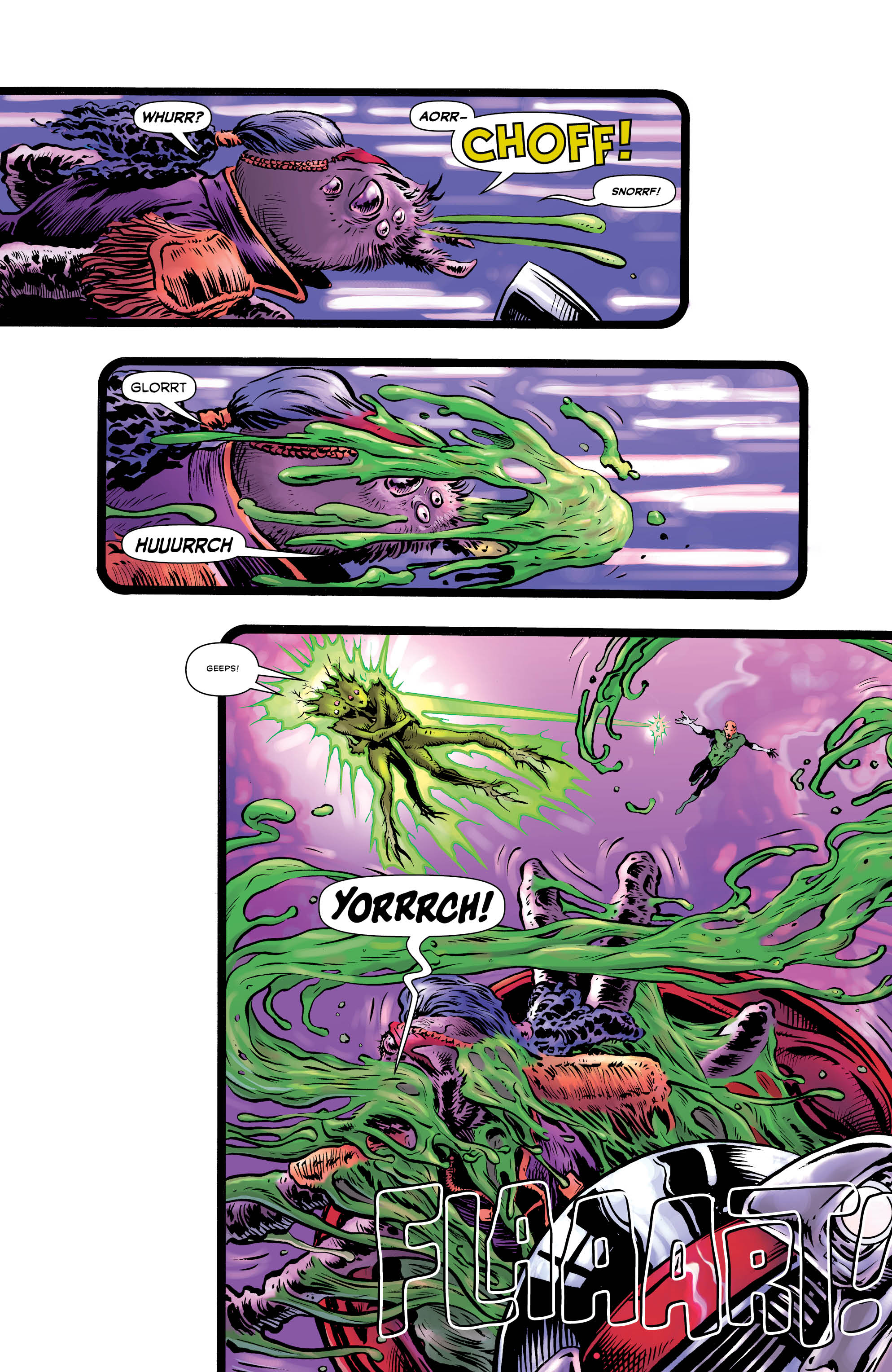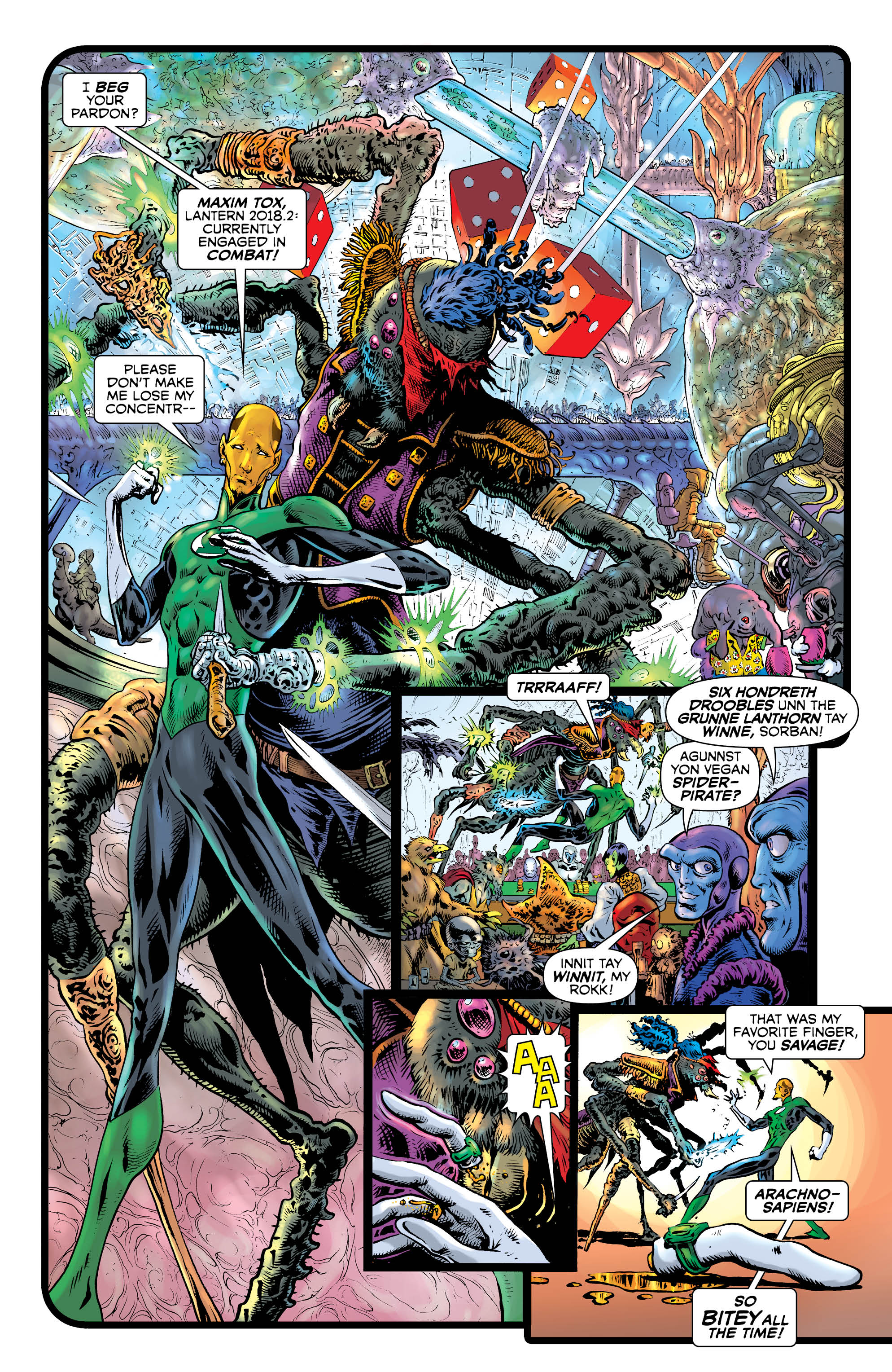 Morrison takes advantage of Sharp’s style by immediately throwing us into a quasi-psychedellic battle on a strange planet filled with bizarre aliens. In the middle of chaos, we see a Green Lantern named Maxim Tox. It feels like an odd choice to start things out with a new character rather than Hal Jordan, but it soon becomes clear why this is the case.