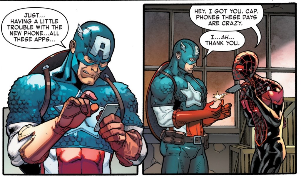 Despite having been thawed from his frozen prison for some time, Captain America is apparently still stuck in his old ways when it comes to certain things. When trying to use a fancy high-tech phone Tony Stark gave him, Miles Morales jumps in so they can use the tech to find the “bad guy.”
