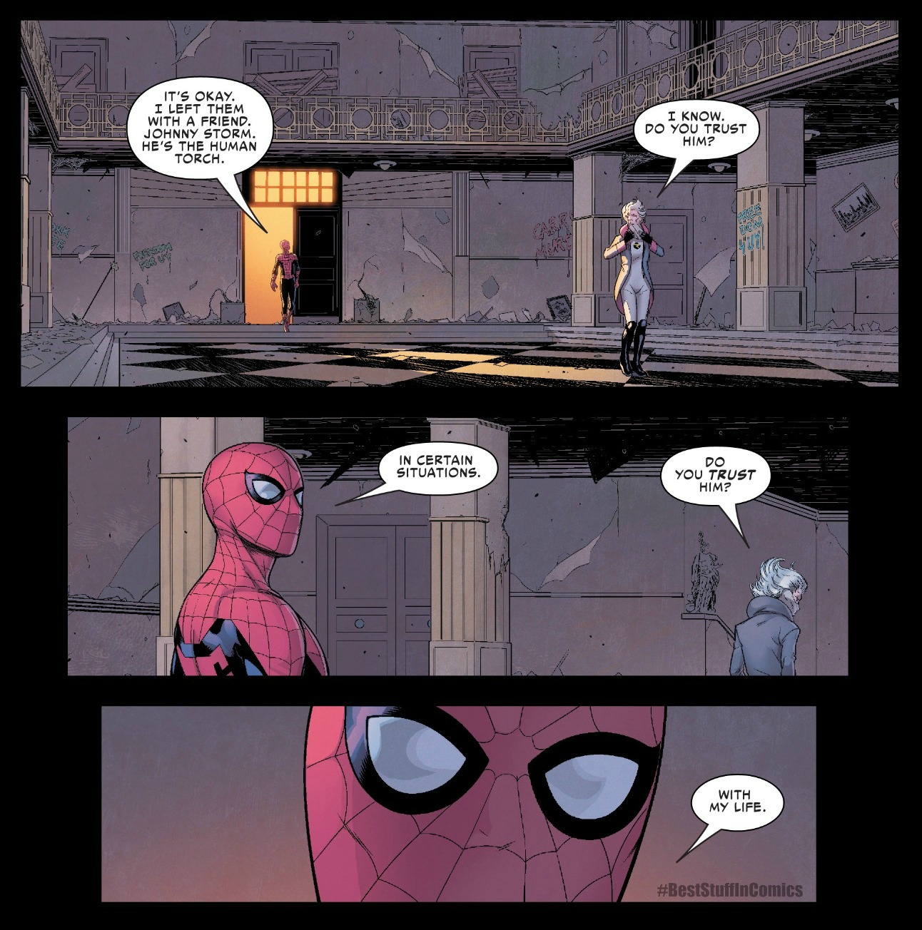 Spider-Man is known for cracking jokes and not usually taking things seriously. When he’s asked whether or not he trusts his friend, the Human Torch, he jokes at first. When asked again, he makes it clear just how much he trusts Johnny Storm. This is a great reminder of just how great of friends the two are.