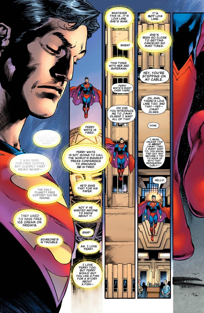 The main factor that sets this apart from the 2015 story is, here, it’s Superman’s decision. Through Bendis’ story and the art by Ivan Reis, Joe Prado, and Alex Sinclair, you can see Kal-El struggling with this decision. There are a lot of emotions involved. This isn’t something he decided to do on a whim. We get to witness Superman telling the important people in his life like Perry White and Jimmy Olsen personally before dropping the bombshell on the world.