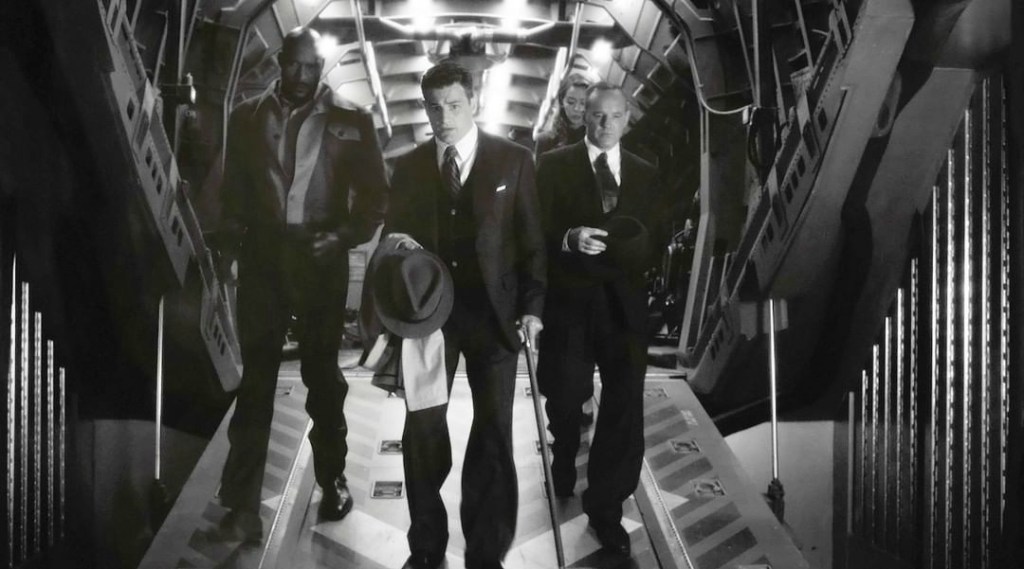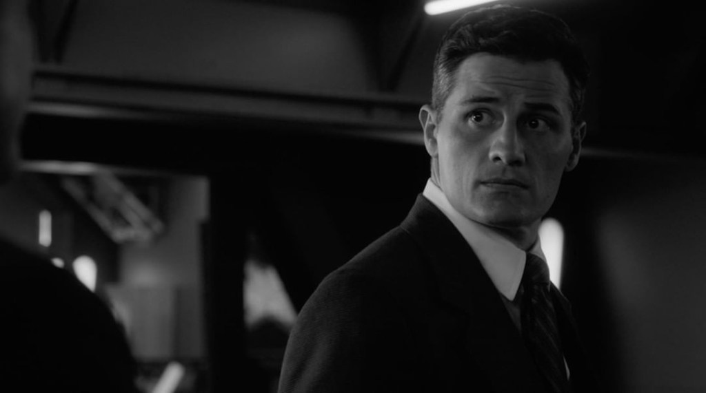 Coulson starts to reboot. He’s narrating, everything is in black and white, and he’s handcuffed. It’s July 27, 1955–the day Agent Daniel Sousa became a legend on his final mission. Coulson narrates Sousa delivered a groundbreaking SHIELD device to Howard Stark and prevented if from falling into enemy hands. Then he was killed. He became the first fallen agent of SHIELD.