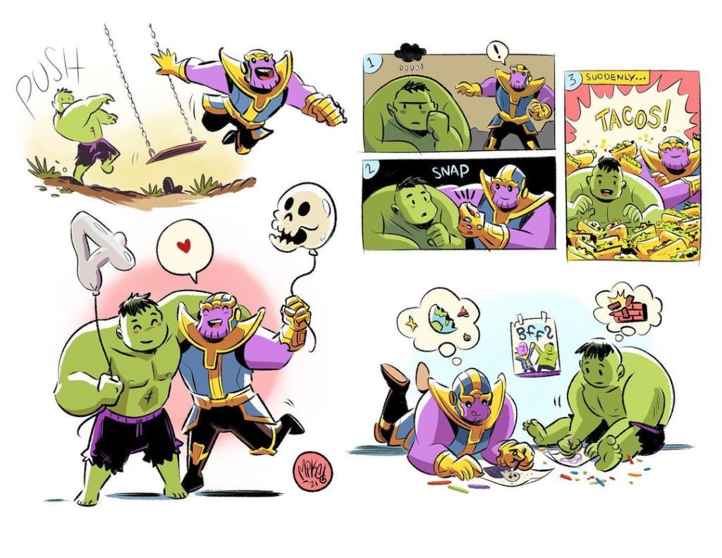 Mike Maihack posted delightful Hulk and Thanos art on his Instagram. His five-year-old said, “Hulk and Thanos are both reeeeally strong. Why do they fight? They have the same powers. They should be friends.” So he drew this.