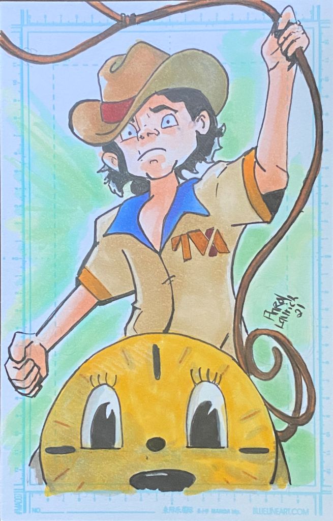 With the events of the show, there are obviously many different version of Loki Aaron could’ve gone with. He went with Loki wearing the TVA Variant shirt while also sporting a cowboy hat. Having him trying to lasso Miss Minutes was a cool added bonus.