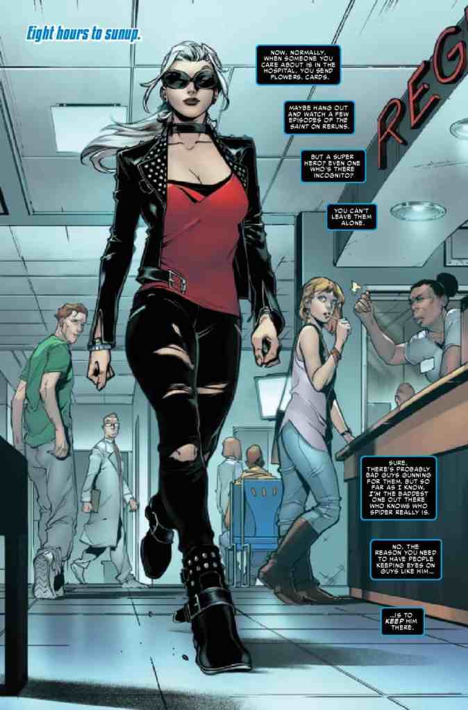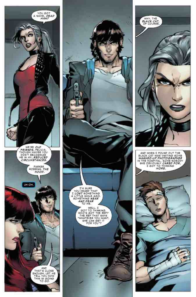 The two characters have had a bit of interaction lately. Spider-Man recently became gravely injured during a fight with Ben Reilly against the U-Foes. As he recovers in the hospital, Mary Jane has been at his side. Felicia Hardy, Spider-Man’s ex, has also been by to check on him and make sure he’s not in danger. The fact that the two care for Peter has allowed them to be civil to each other. Civil enough to “team up” in the same comic?